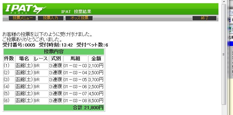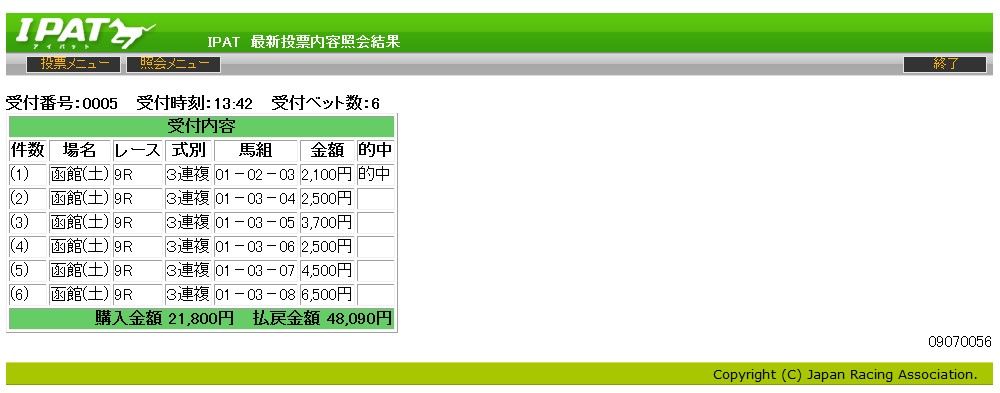 7月会員様には新潟6レースの提供となり。3連複2170円的中となりました。