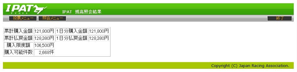1レース3万円購入のため、3週間で6レース×3万円=18万円馬券購入