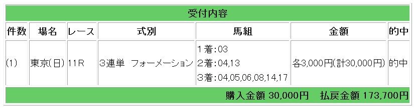 ダービーでは1番人気の皐月賞馬ディーマジェスティよりも3番人気の◎3マカヒキからの馬連7倍(1万円購入)的中、3連単46倍(1000円購入)的中となり、11万6000円の獲得となりました。
