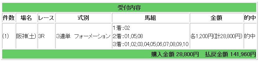 6ギルテッドミラー(特注厩舎情報馬・高配当の使者)が3着となり、ワイド12.3倍的中で14万7600円獲得