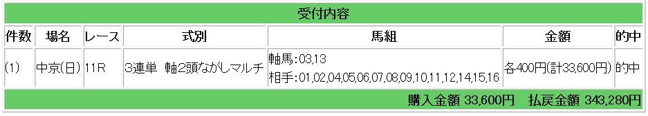 会員様には上記情報馬2頭からの3連単指示となり、2着に12番人気のショウナンラブリーが入って1105.5倍的中となりました。