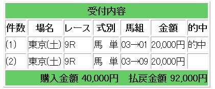 報馬の馬連1点指示で3.6倍的中となり、21万6000円の払い戻しとなりました。