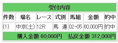 上記情報馬のワンツー決着となり、馬単6.1倍1点的中で18万3000円の払い戻しとなりました。