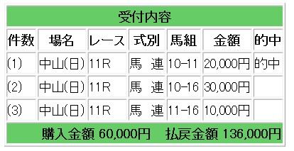 会員様には上記情報馬からの馬連指示で6.8倍的中となり、13万6000円の払い戻しとなりました。