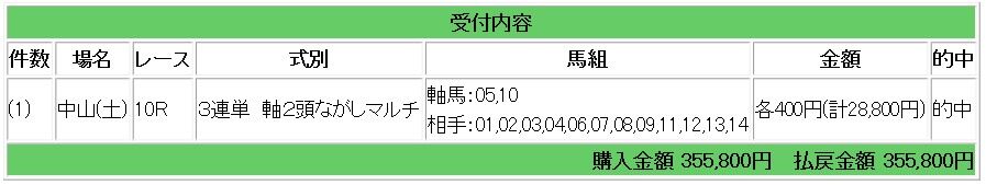 上記2頭が2,3着となり、3連単889.5倍的中で35万5800円の払い戻しとなりました。