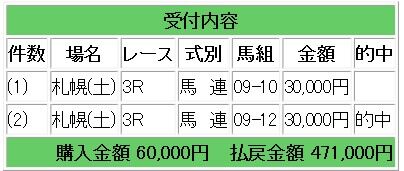 会員様には9イラーレ(強力騎手情報馬)からの馬連2点指示で15.7倍的中となり、47万1000円の払い戻しとなりました。