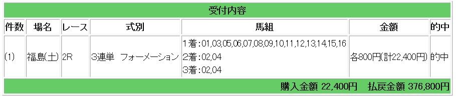 情報通り1番人気のブルボンクイーンが3着に取りこぼし、471倍的中で37万6800円の払い戻しとなりました。
